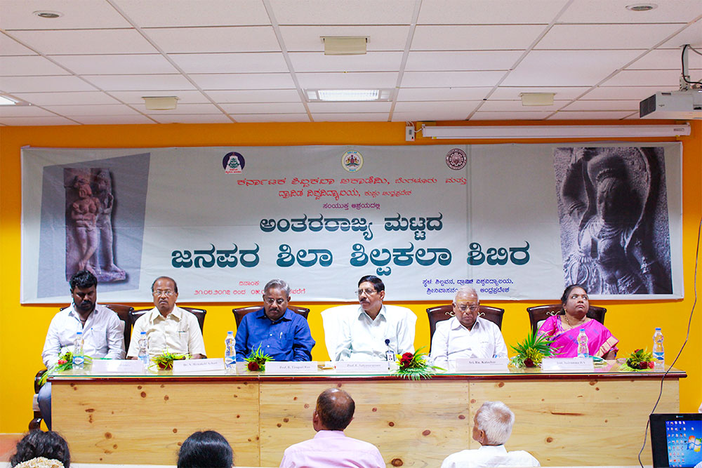 Professor Sharadha is a dean of Kannada literature at Dravidian university. She had taken all the precautions to bring Shilpakala Academy to their university. The previous work of Shilpakala Academy inspired her at Bijapur University and Karnataka University at Dharwad. Later she tried contacting the Shilpakala Academy President. She received a quick response to the camp and got the date sanctioned. Professor E. Sathyanaryana (VC), Professor Tirupathi Rao (Registrar), and Professor Sharadha all together decided on a theme of Dravidian culture and style for the sculpting.