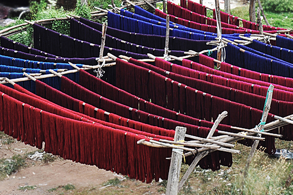 The traditional saree from Chettinad is made of pure cotton. The yarn procured from Coimbatore sent for cleaning process (locally called), where starch is applied to increase the strength followed by coloring process, washed in normal water and dried in room temperature. The colored yarn is wound to the pirn for the weft, where the yarns are dipped into the vessel containing water for the color check, strength and then wound. Simultaneously the yarns are stretched, opened, looped by using stout bamboo rods and dried outside (street) for the warping process. The newly prepared warp is attached to the corresponding thread of the previous saree, where the process of weaving (for next saree) continue by attaching the corresponding threads.
