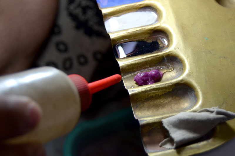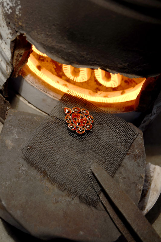The jewelry piece has to be fired as many times as the number of colors used. Firing could be done in an electric kiln or on the coils of the domestic heater using a thin iron mesh. This fuses the color to the gold. Once all the colors are filled in and fired, the piece is scrubbed with a filer to enhance the gold outline of the pattern. Then this is boiled with a mild acid for sheen and sent to the next karigar for stone-setting.
