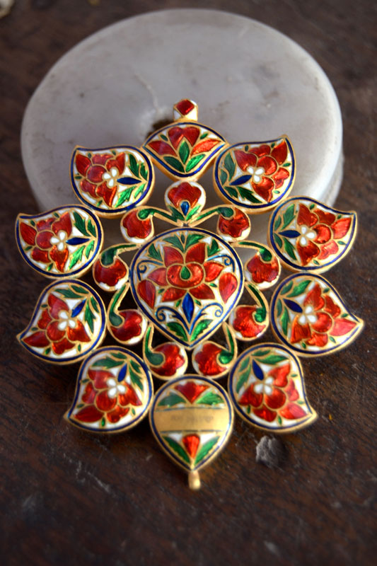 ‘Meenakari’ is the technique of decorating the jewelry with enamel. It is an intricate and laborious process. Mostly red, green, blue and white are used. Combination of these with the color of gold is called ‘Panchranga’. These colors are applied with thin needles or spokes in the engraved pattern.