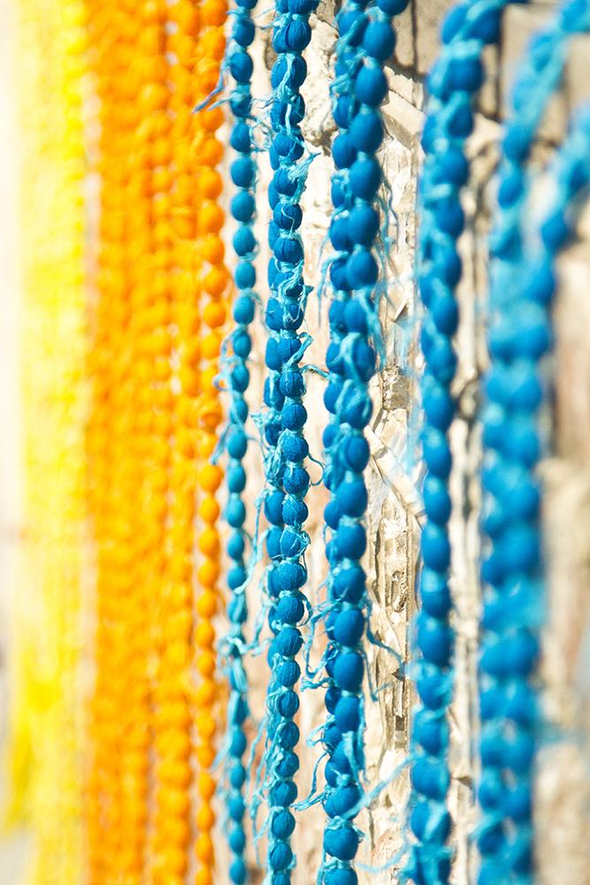 Generally, cotton or silk cloth is used for dyeing in this process, the cloth brought from market is washed off to remove any residue such as starch, sand, dirt etc., the wet cloth is then dried for further process, ensuring flawless white piece of cloth. After the cloth is dried, it is twisted with the help of two members, one at either end, it is twisted such that it creates enough tension, and then is transferred onto a wooden stand, consisting of a horizontal table with vertical cylindrical pole, the twisted cloth piece is wrapped around the wooden pole firmly, such that it does not loosen up the carefully done twisting, the wrapped cloth is slowly removed bit by bit and threads are tied to it tightly, which acts as a resisting agent, from dyes. Knotting is done in a precise and regular interval of gap onto the cloth, parallel to each other, which gives cloth its signature waveform kind of a design after dyeing. After the knotting is done, cloth is unwrapped, knotting distance depends on the intricacy of design required, from nearby knotting to knotting with larger distance in between and with more thicker and thinner knotting. After the knotting is completed, the cloth is dipped in water, to make it absorb the further dyeing process, once ensuring the cloth is absorbing water, it is dipped in dye based solution, depending upon the color required and upon the intensity of the color, mostly chemical based dyes are used in the process, dyeing depends on the requirement of the end product, from rainbow colored cloth, which consists of multiple pastel shades of color depicting rainbow, to single color stoles.  It is then put to dry as it is with the knots, once dried, the knots are carefully removed, so as not to damage the cloth and is washed for one final time, and is put to dry.