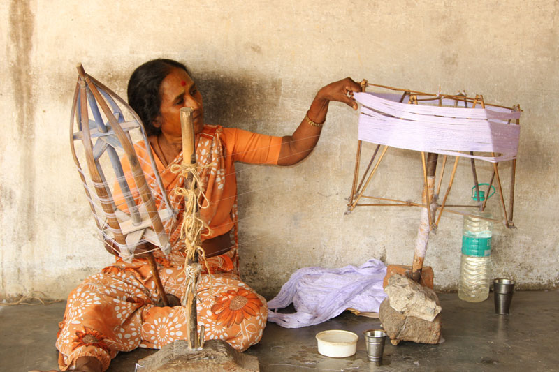 The spinning is done manually using spinning wheel. The bundle of yarn is placed on the spinning wheel to wind the yarn from bundles to bamboo spools. This process is done to remove entangles in the yarn which helps for smooth horizontal weaving. Cotton yarn which is reeled around bamboo spool is again reed onto spindles.The reeled spindles are further inserted into the fly-shuttle to process the weft.In Kanchipuram, spinning process is done by women in their leisure time.