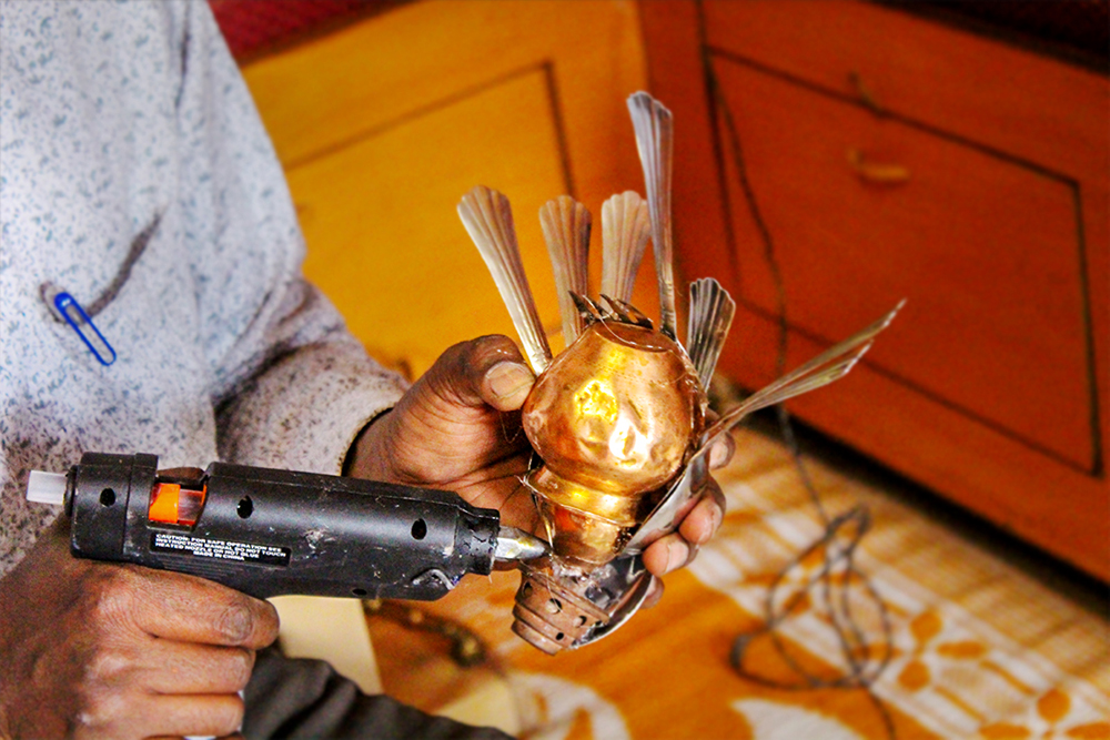Firstly the artisan selects two copper vases of different sizes to make the body and they are attached to each other with glue. Then spoons and forks are arranged to check the body proportion and spoon positions before they are glued to the vase. Once these materials are placed correctly and glued well, the fork heads are separated to make the tail and wings of the bird. Here the lantern burner makes the head part, hair clips the beak and nuts the eyes of the metal sculpture. After the completion of all the above steps, the finished bird is placed on a rice bowl to establish a theme.