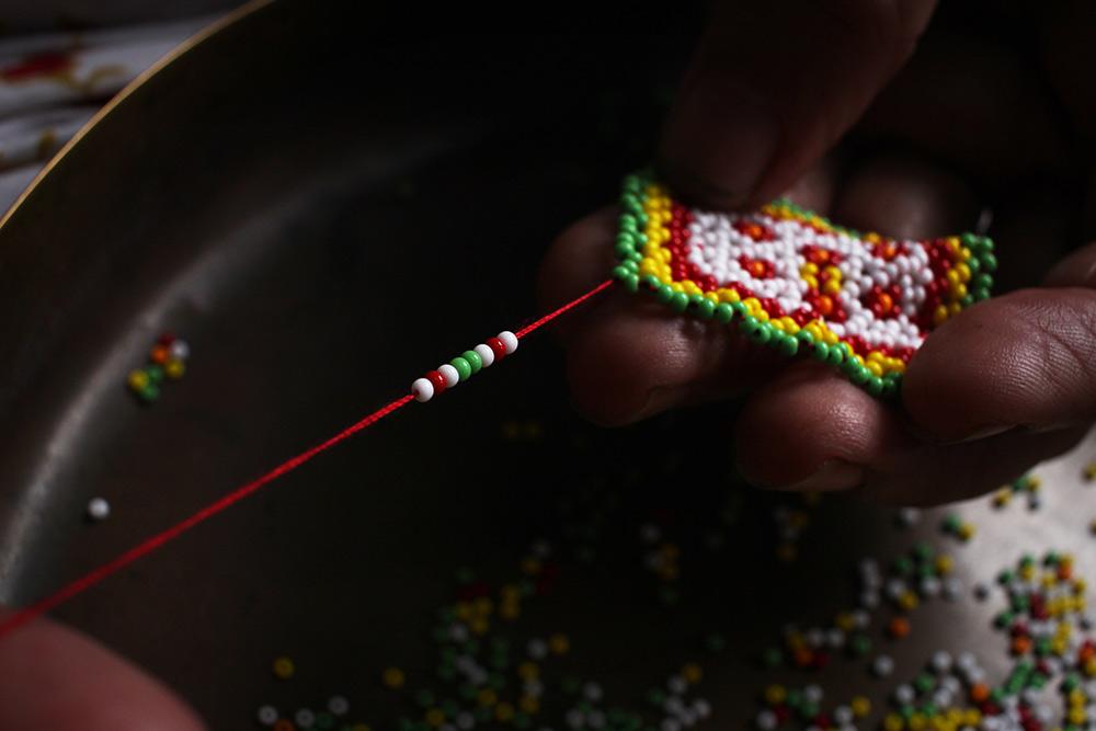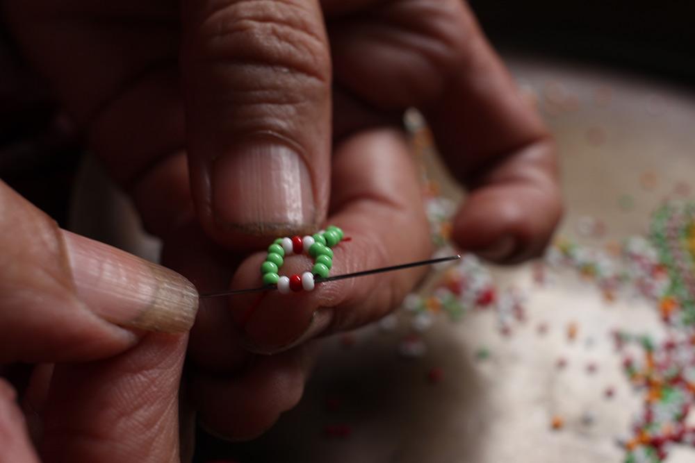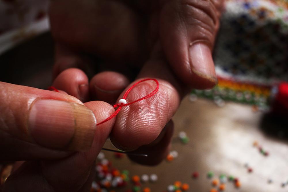 The process of making Motibharat artifacts is unique in its style. The beading is not done on the surface of any fabric as well as there are no predesigned graphs to follow. The designs and patterns are always done with imagination and calculations. Most of the designs and patterns are traditional and have been passed from one generation to another one but at the same time, the artisan is having the freedom to do improvisation as well to develop new patterns and designs. The making of Motibharat artifacts always starts with a knot on the thread as well as making a locking with a bead to avoid the awkward projection of the knot.