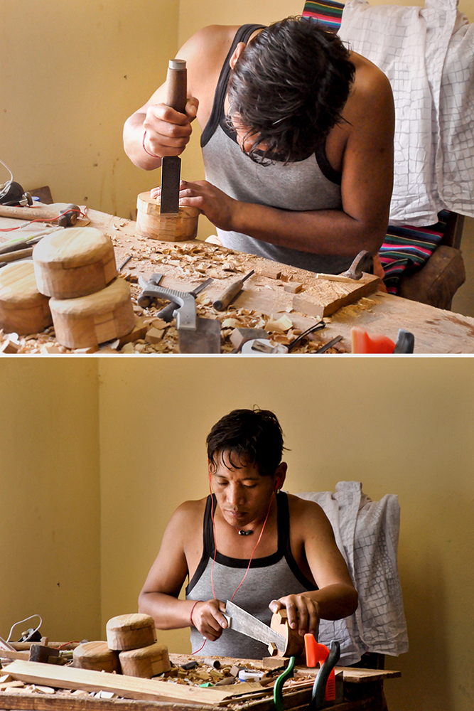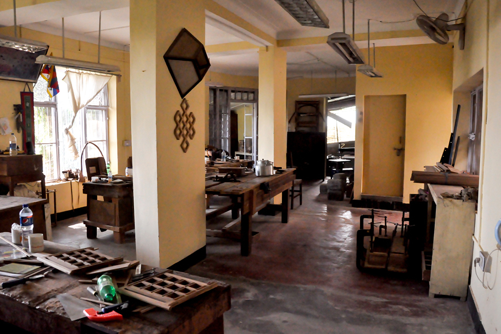 Starting the apprenticeship with drawing practice is the basic rule of Buddhist art, hence this also applies to Buddhist wooden art. The students illustrate designs on a paper until proficient and then slowly moves to simple wood drawings and carvings. Beginners start with pinewood carpentry, gradually moving to teakwood. Once a design is drawn onto the wood, the artisan drills a hole to make space for a fret saw. This fret saw with a strong bamboo frame helps to cut out extra portions of wood that are even less than one square centimeter in size. The ready work is then polished in an old-fashioned method or painted in rich colours, and some are even embellished with gold leaf. The product type ranges from elaborate cabinets and thrones for shrine-rooms, monasteries and temples to even incense stick holders and folding tables.