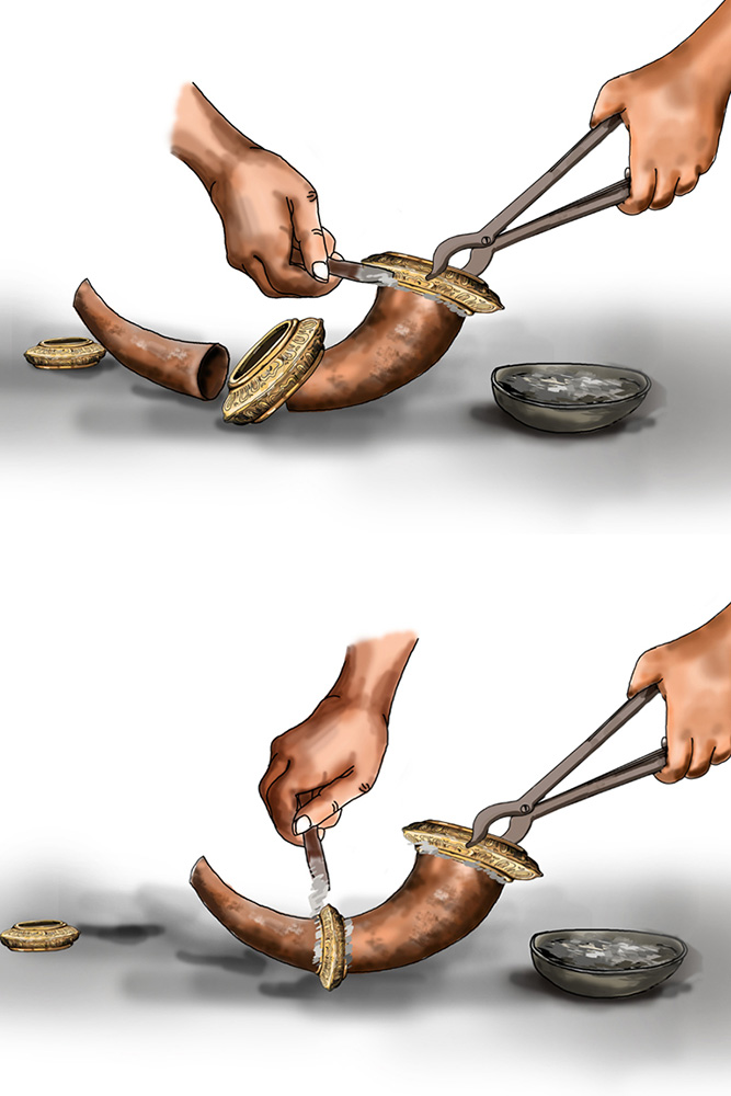 The making process of Ransingha may seem a little old-fashioned with a mixture of copper and bronze pipe, but it’s value is high for over a century. From the ancient kings' age to the average living civilian age, it has been followed by the same tradition and culture. The Ransingha is of 's' shape and made of copper and bronze. The process starts by cutting a copper sheet into the required length. An artisan gets an appropriate shape by hammering the piece of copper sheet. The copper sheet is beaten and brought to form 's' shape with a wide-open hole in the upper end and a narrow hole at the lower end. The stainless steel metal wire is tied accordingly to keep the cylindrical shape firm; then, a metal paste is applied at both ends to stick it for a long-term hold. After that, it is heated on the fire burning by charcoal until the sheet turns completely red. Heating helps in filling the gaps of the ends where the metal paste has been applied. Again the same process is continued for three more joints of this shape. The Bronze sheet is cut accordingly and is hammered in a compact size for making the rings. The rings are carved in traditional design. Five bronze rings are prepared and attached one after another at a certain distance on the pipe. The rings are attached with the help of metal paste, and each ring differs in size. A small circular piece of bronze is fixed as a mouthpiece at the starting point of the Ransingha pipe, which supports blow by mouth. After this procedure, the Ransingha instrument is polished for smoothness. The making process of this instrument takes around five days to get completed. After the process is completed, the metal wire is removed from the instrument.