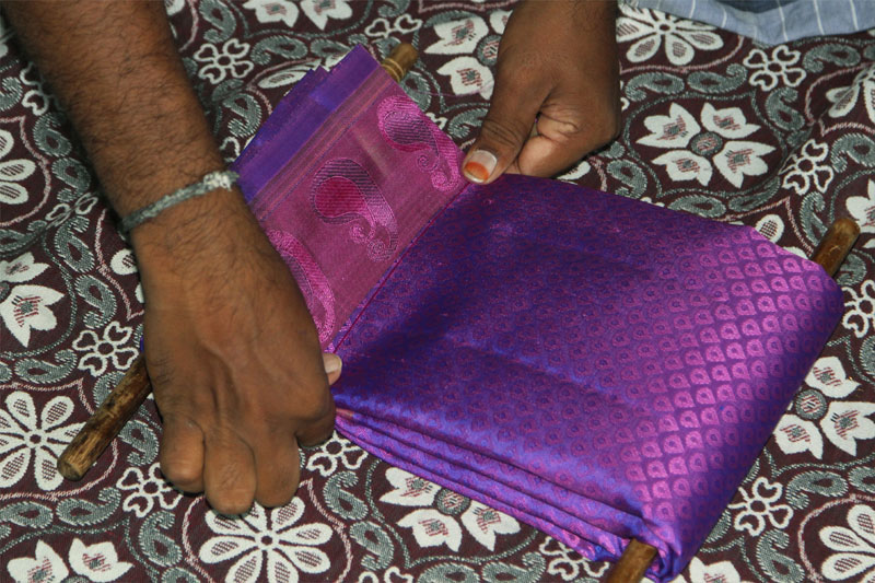 Weaving is done on the fly shuttle pit looms. The weaver interlaces the silk threads of weft and warp. The shuttle passes through the opens formed when the pedal is operated to interlock the threads of warp and the weft. Once the shuttle is passed, the suspended rope from jacquard is pulled to form the weave. The proton of woven cloth is wounded to the wooden beam which is in front of the weaver. After weaving of 6 meters of weft, the portion of unwoven warp is intentionally left before and after the sari weaving which is later knotted for fringe. Thus the weaving is completed; the unwoven stands are cut out with a small metal blade and sari is folded in traditional manner for the marketing.