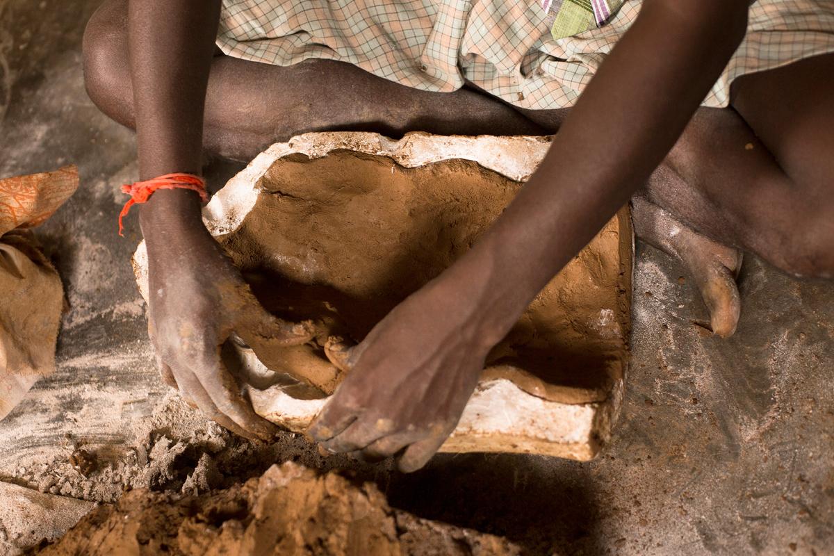 As per the amount of clay required the quantities of clay is taken and knead with hand to obtain the clay into a roll form. Moulds are dusted with the chalk powder in a loosely tied cloth to get the impression to which the clay material has to take up.