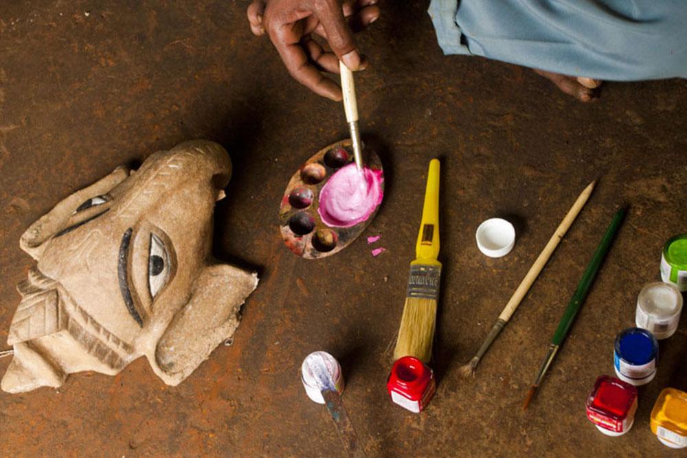 The process of making a paper mache mask begins with preparing a paper mache. Pieces of paper are soaked in water till they soften. Water is squeezed from soaked paper pieces. The softened pieces are then beat with the help of mortar and pestle till it forms mache. Dhaman tree gum and clay are mixed into the mache. Now the dough is prepared for the moulding process.