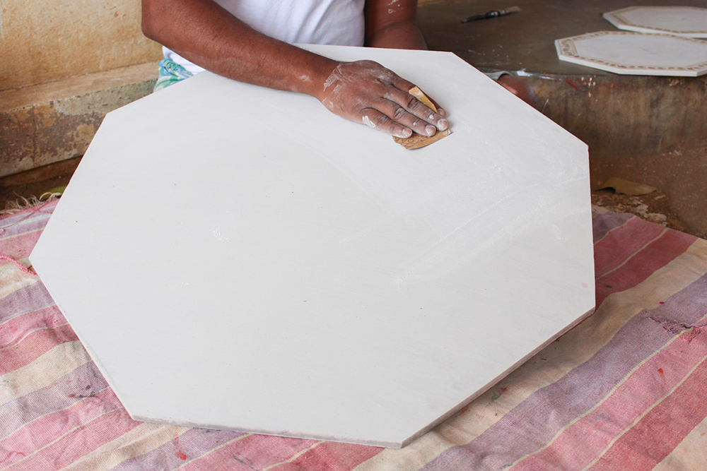 An ordinary wooden slab (chatris or palkis) is used to make Kinnal art. They are cut into circle, square or octagon shape. The process starts by applying mixture of chalk powder and gum and is applied evenly on the wooden slab as a base. This is kept for drying for some time. After it is dried, the surface is rubbed on by sandpaper to make it smooth for painting. Artisan uses scale, pencil and diameter to draw the borders on the slab. Gesso work is made on the borders and in the middle of the wooden piece. Gesso is a compound made of chalk powder and gum and distemper colour. The gesso work is basically made on the borders or in the center of the canvas. The designs are surrounded with flowers and leaves, with any mythological character in the middle and dried (chalk powder). After this is completely dry, silver foil is cut as per the required form and pasted evenly on top of the gesso work with the help of a brush and adhesive.