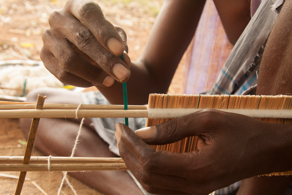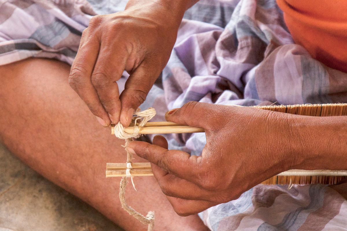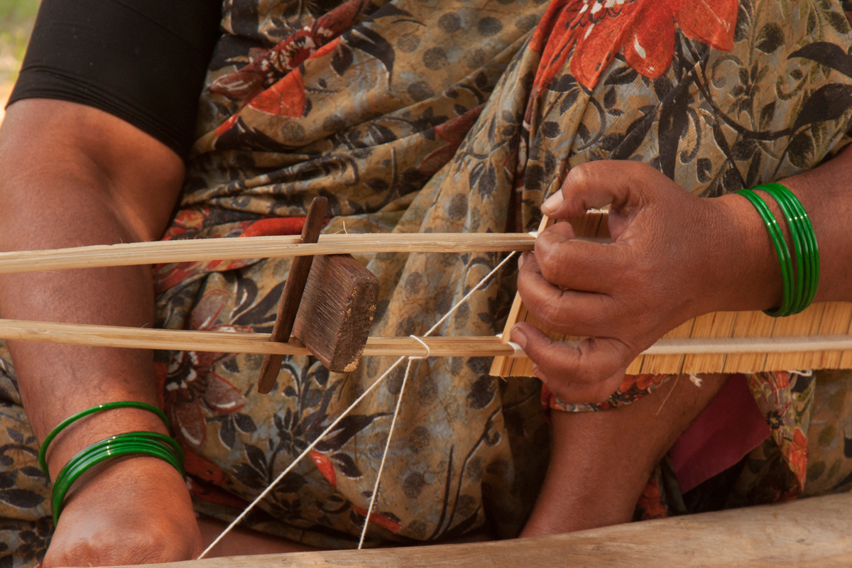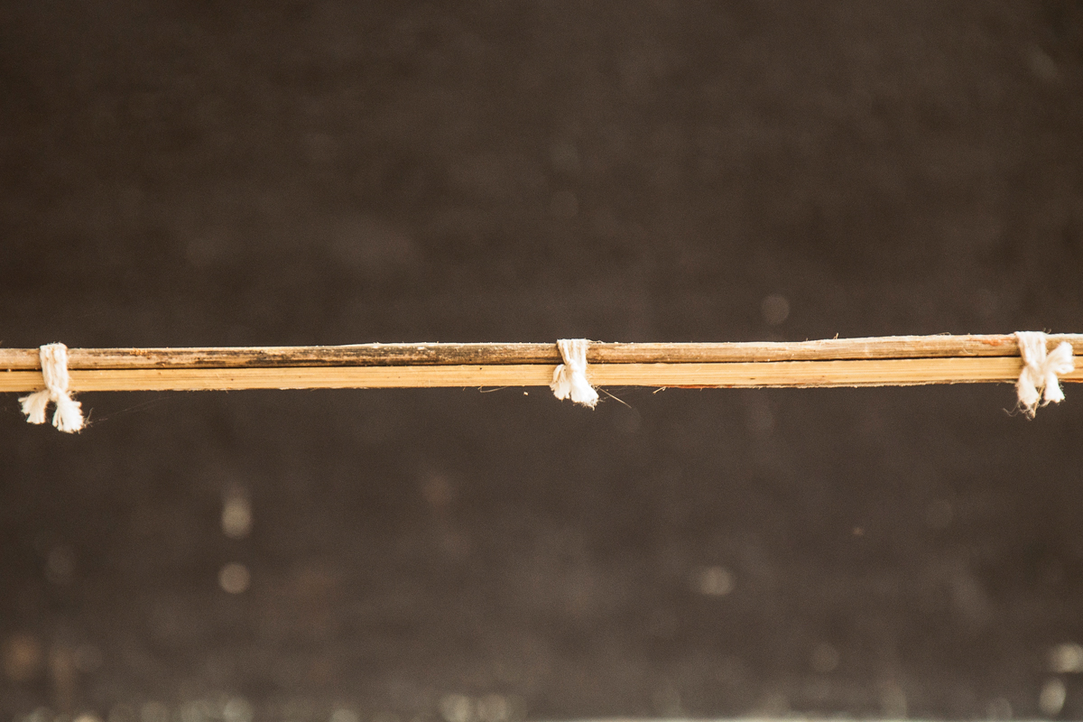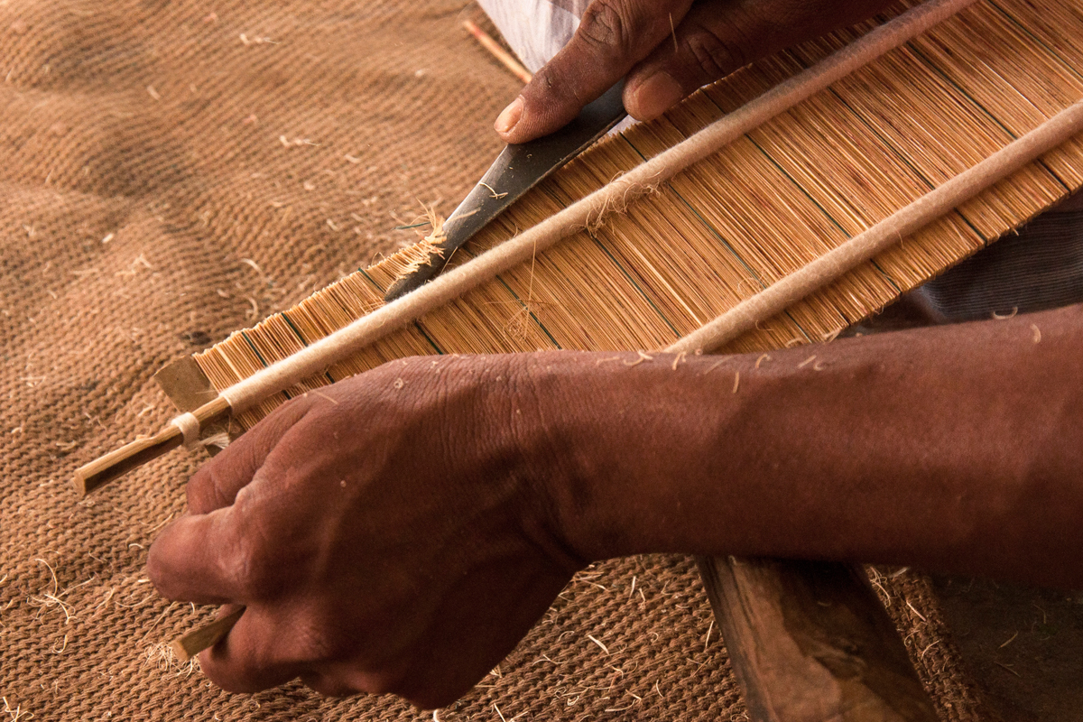 Jowar stem cut into small pieces, and then a customized tool locally called (Gutam) it acts like a stand with a knife (Hine cheve katti) resembles a sickle shape which is fixed firmly. Craftsmen holds the stem at one end then scrapes the excess part, he continues the process until a finer quality is achieved. Reeds are then kept on a wooden peg (Tugni) and cut into equal length. A wooden frame is set up, which is approximately 2 feet from the ground is used for weaving the reeds. Bamboo stick is cut into required shape and then scraped, craftsmen bits the bamboo stick and repeats until the stick is in a straight position. Two bamboo sticks are aligned on the wooden frame with 4 inch in difference before the weaving of reeds starts. A wooden block is kept in between the two bamboo sticks. The top stick is marked equally to one and quarter inch till the end. One and quarter inch is one bit where 60 sticks are stitched. Craftsmen starts knotting each strip on the top and bottom, with two different bundles of cotton thread. Cotton thread no 20 is used in weaving reeds. The total length of a reed is 51 inch consisting of 40 bits together 2400 jowar stem is used in a single reed. Craftsmen uses a unique marking system where he uses the 60th stick as the colored one for marking and precision. The color green is used is locally available in the market, it is boiled and mixed with salt making sure that the color doesn’t stick to the fabric when it is on the loom. Climatic conditions matter a lot as rain water are not suitable for weaving reeds, a drop of rain water can make the stem non usable. Weaving of reeds is done in great speed and accuracy making sure that 60 sticks are in one bit, the synchronization of body and mind can be seen while weaving reeds. A knife is used to scrape out any rough textures on the reed. The upper part of the stick, which lies above the bamboo stick, is then stuck using adhesive. A thin sand paper (water sheet) is used to level the stems and smoothen it.