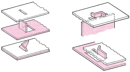 Spring force can be used to fasten parts together. The figures below illustrate the type of fastening effect that can be achieved with spring-type holding devices. The assembly operation requires only that the spring or spring-like receptacles be snapped into place.