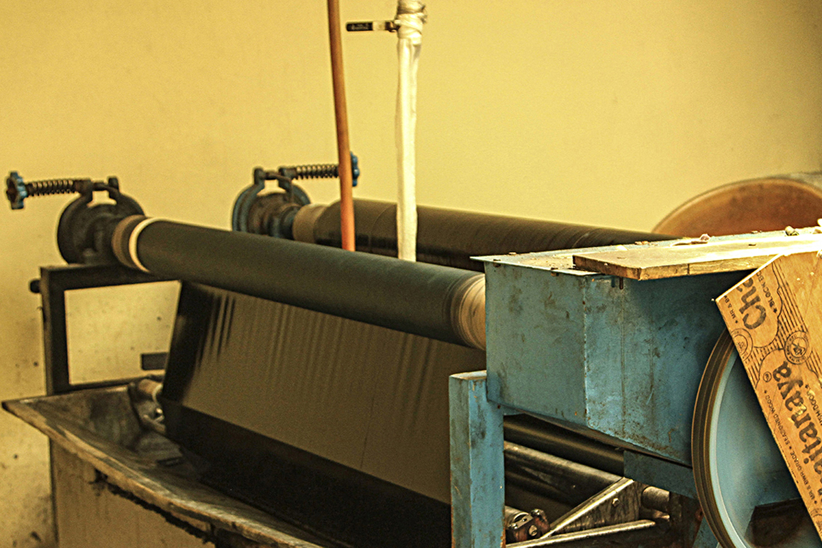 Generally thick cotton yarn is preferred for making (weaving) of these clothing. Yarn in the hank form are wound on to pirns or bobbins which is either taken for the warp or weft part of the loom. Bobbin of about 104 numbers are fixed on the creels to prepare the warp beam of the loom. Each yarn is passed through the heddle shaft wire as per the pattern of the design to be obtained.