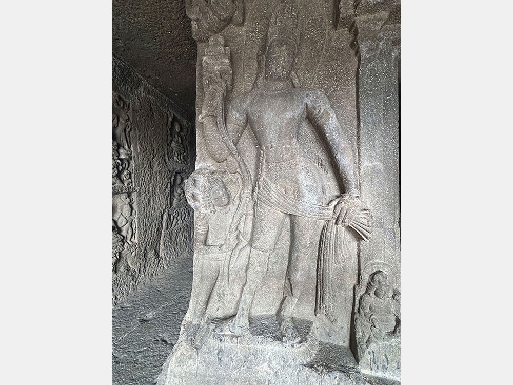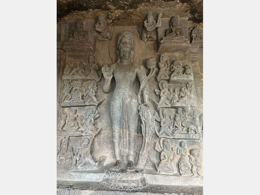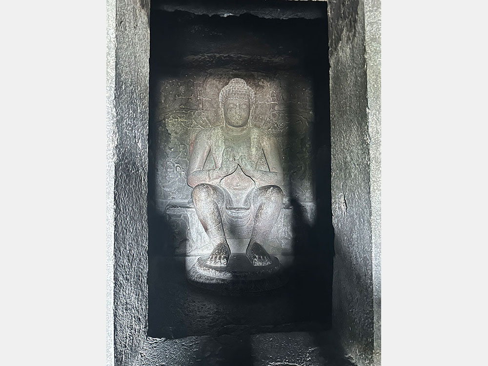 There are 34 caves in total, dating from the 5th to 10th centuries CE. The pillars are richly carved with foliage, Mithunas and also Jataka tales. Caves 1 to 12 are primarily Buddhist, with notable examples like the Chaitya Hall (Cave 10) featuring a large stupa. Caves 13 to 29 display Hindu themes, with the impressive Kailasa Temple (Cave 16), which is a monolithic structure carved from a single rock. Caves 30 to 34 are Jain, featuring intricate carvings and altars.