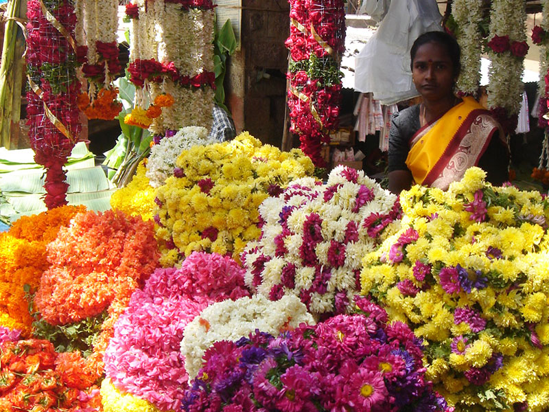 Flower being sold on the streets of Malleshwaram market in Banglore – the flowers come mainly to the City market and Russel market from where the flowers get distributed to other markets around the city. Flower markets are a pleasure to see because of the natural colours.