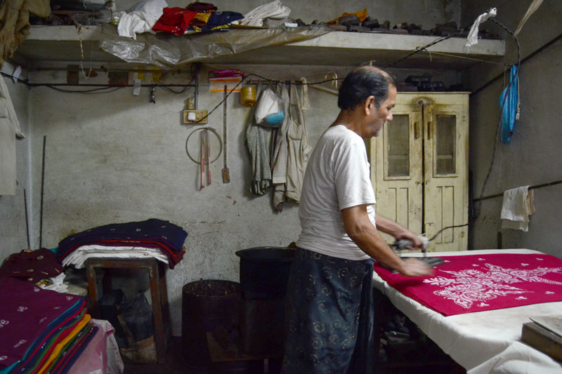 After the initial printing, the fabric is soaked in napthol. Then it is dipped in a cold dye of the lightest color, say yellow, for ten minutes. Once it is dry, it is waxed where yellow is needed and dyed in the second color, say red. This process is repeated as many times as the numbers of colors required. The characteristic effects of batik are the fine cracks that appear in the wax, which allow small amounts of the dye to seep in. These are actually formed by the cold dye bath. After the multi color dyeing is done, the fabric is dried and placed between two layers of absorbent papers. The wax needs to be ironed out of the material into the paper. Dipping the fabric in hot water can also get the wax to come off.