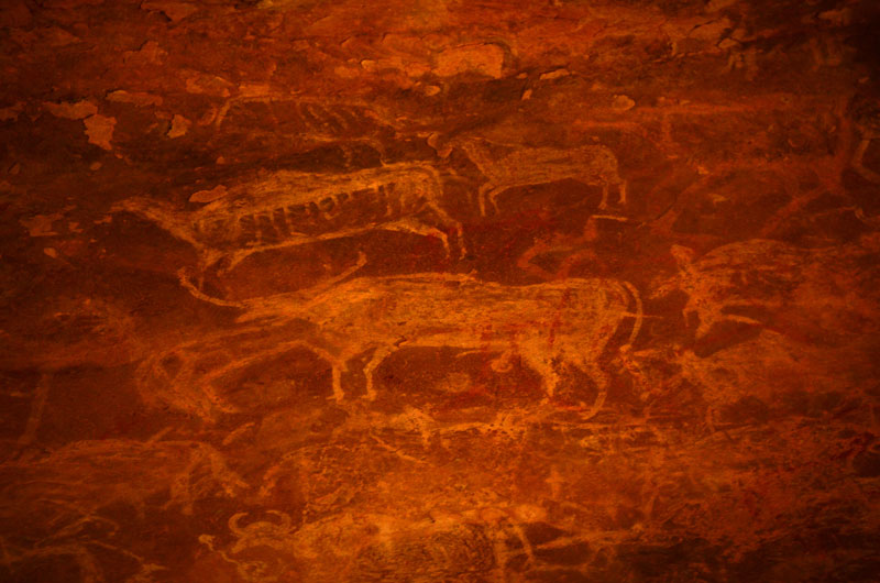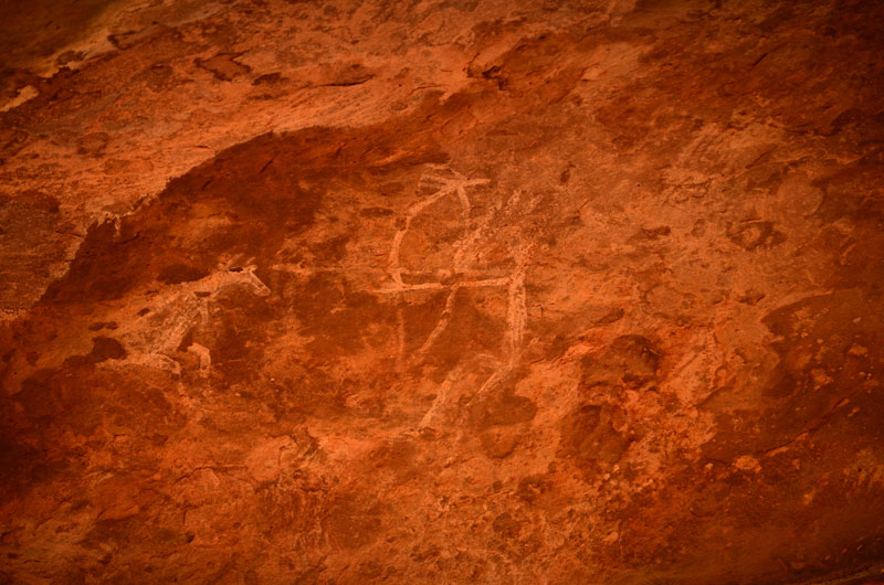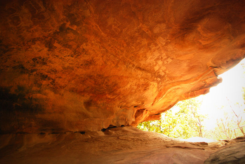 This rock shelter is also known as ‘Zoo Rock’ due to its large scale and numerous stylish animal paintings. The shelter displays total of 453 figures, which also includes 252 animals of different species. It shows ninety human figures, one bird, six decorative designs, two enclosure and ninety-nine fragmented figures. The shelter has approximately ten layers of superimposed paintings mostly belonging to Mesolithic, Chalcolithic and Historical period.