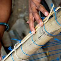 Chick mat making looks simple, but it takes lot of practice and hard work to gain the expertise. The whole of the family members get involved themselves in the process of making chick mat. The craftsmen begin the process by taking the customer’s order. The measurements of the windows and doors are taken. Initially the first outer layer of bamboo is peeled with the help of a knife. Then they are cut by the saw tool according to the measurements. Bamboo is made into two equal pieces vertically, later it is sliced into sleek pieces through the help of the sickle. The wooden stick is tapped on the sickle with a force, to slice the bamboo.