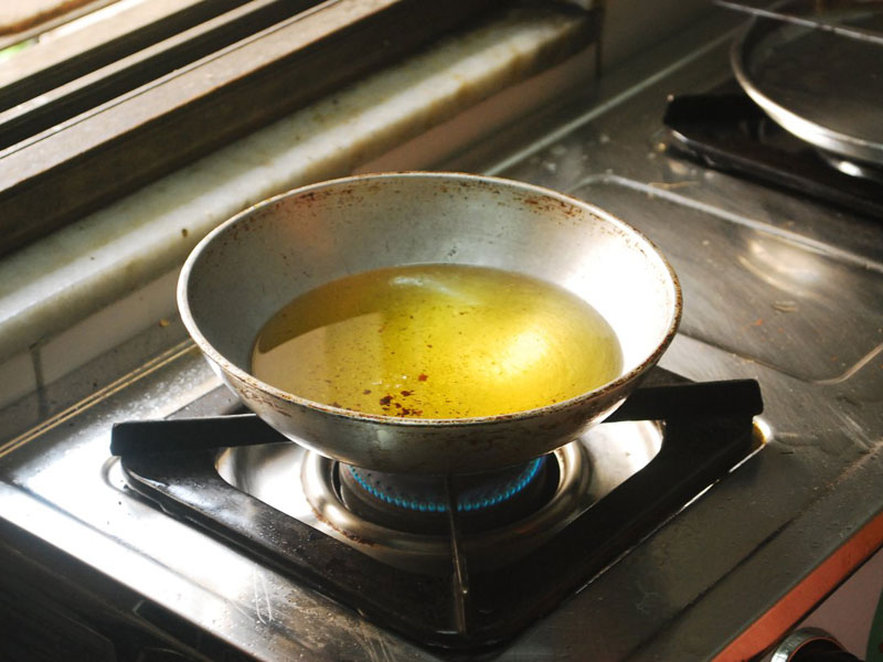 Since the preparation involves deep frying, oil is poured gradually into a deep utensil of aluminum or copper base and allowed to heat gradually.