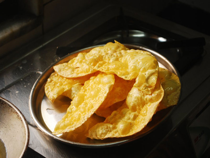 To check if the oil is hot enough for rapid frying, a small piece of the 'cholafali' is put in for testing.