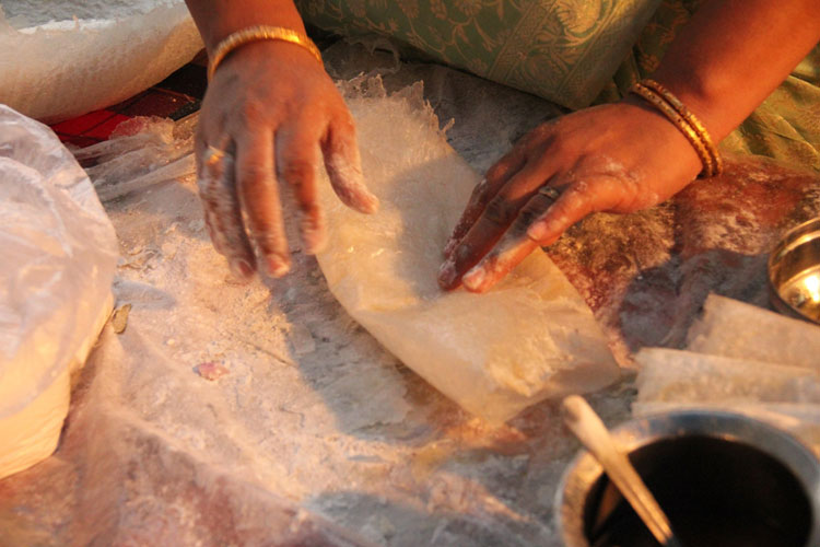 Pootharekulu, Putharekulu, or Putarekulu, some times called "Paper Sweets" by the Andhra people, is a sweet dish of Eastern and Coastal Andhra Pradesh of Southern India. It is a sweet version of a Vegetable Roll where the vegetables are replaced by finely ground sugar powder in finely laminated foils made of rice. The wafer's size varies from 100 to 1000 micrometers depending on the expertise of the person who makes it.
