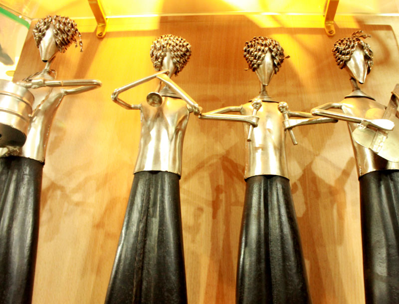 Craftsmen experimentation with mixing more then one material and techniques have been used to make these musicians. Various techniques used to produce the musicians are Coiling, twisting, soldering, casting, painting and ornamentation. Upper body inspires western tribal art and lower body inspires the traditional style.
