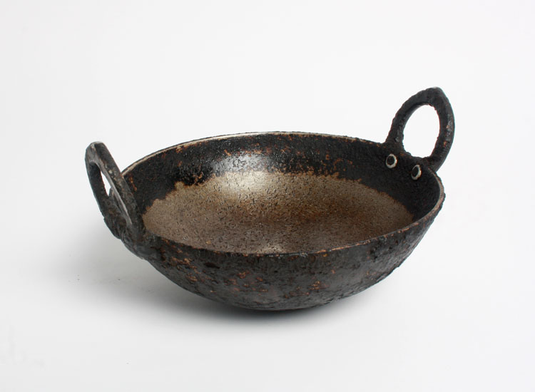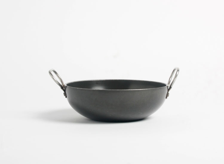 The traditional Kadai is usually made of thick high-carbon iron, cast-iron, brass, or aluminium. Better quality Kadais have a heavy bottom where a layer of aluminium is sandwiched between two layers of stainless steel for better and even heat distribution. Nowadays they are also available in the non-stick (Teflon coated) material, hard anodised aluminium too. Some of them are available with lids too.