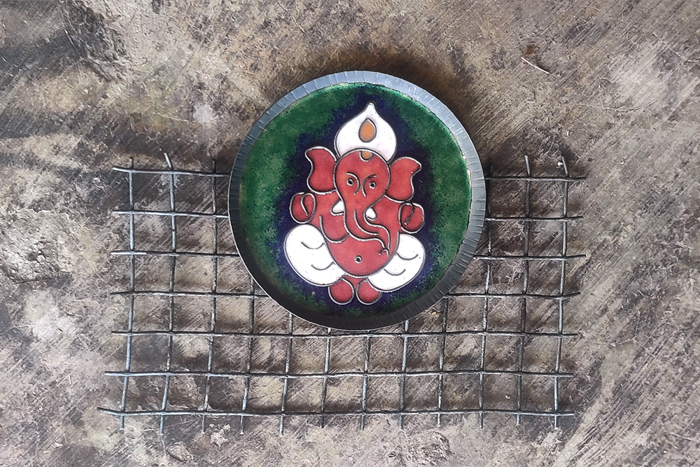 Usually, metals like gold, silver and copper are used for enamelling. The metal articles or jewellery are embellished with colourful enamelling. The powdered glass can be applied either wet or dry to a surface. The colourful glass powder is laid onto the copper surface according to the pattern or design and it is put on high heat to melt the powdered glass. This process results in a coat which is formed on the copper surface. The end result not only lends its vibrant colours to the copper surface but also prevents it from oxidizing.
