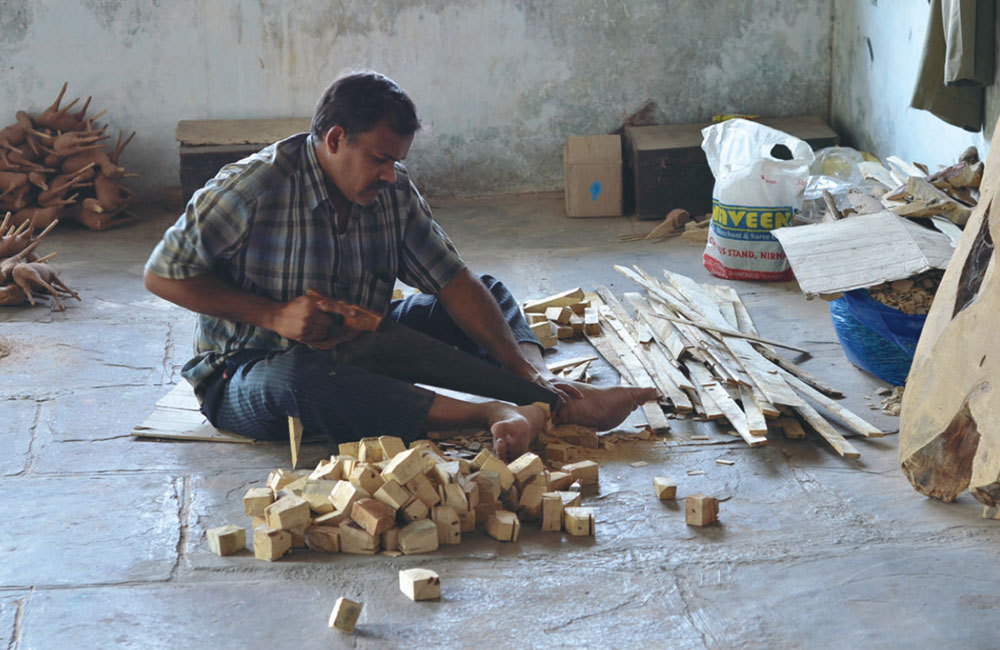 The Nirmal toys are made up of locally available “Ponki Chekka” which is very light and flexible and can be cut into desired shapes and sizes depending upon the toy to be made. Then various parts of the toy are glued together by specially prepared glue and coated with “Chinta Lappam”, which is prepared from sawdust and boiled tamarind seeds and coated with white clay, which smoothens any ridges and depressions if any in the toys. The toys are then dried and finally coloured with brilliant colours. Mostly indigenously prepared hues are used for colouring the toys. Very rare and occasional use of synthetic colours is done.