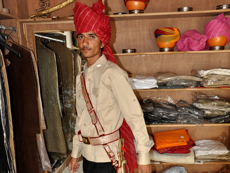 Jodhpuri Safas are the most well-known turban designs around the world . They are especially famous for their prints and patterns bringing forth the colourful image of Rajasthani culture. A ‘Safa’ or ‘Pagadi’ (in hindi) is considered to be a mark of honour for a man. A man wearing the safa along with the traditional sherwani is seen as a perfect gentleman. A safa is generally 10 meters long with a width of over 1 meter. It is worn as a collective circular bun over the head and a part of the safa hangs as a tail. The head bears a fan like form in case of a few Jodhpuri Safas. The patterns and colours used are bright and intense mostly printed on cotton cloth. Safa wearing tradition is an integeral part of not only everyday wear for men, but they also continue the tradition for special occasions and festivals of Rajasthan.