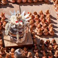 The town accommodates two hills, namely Chandragiri and Vindyagiri. Here the statue of Gomateshwara is erected on the Vindyagiri Hill by King Chandrayana of the Ganga Dynasty. It is believed that monks used to seek sanctuary at the site to meditate and attain salvation. Standing 58.8 feet tall, Lord Gomateshwara, also called Bahubali, is adorned with thousands of liters of milk, panchamruta, sandalwood, turmeric, saffron, vermilion, and holy water, every twelve years as part of their grand celebration called Mahamastakabhiseka. This ceremony is believed to shower eternal happiness to humankind. The terrain’s name Vindhyagiri remained unchanged even after the town name was converted to Gomatapura in the late 10th century. The name "Vindhyagiri '' is derived from Sanskrit words ‘Vim’ meaning spirit and ‘Dhya’ as meditation, describing the spot as a favorite abode for monks to practice penance on the supreme spirit. The hill, located about 3,288 feet from mean sea level and 438 feet above the ground, holds a Bahubali statue of 58.8 feet in height. High and heavy granite mass forms its pedestal, making 614 steps to reach the structure erected atop the hill.