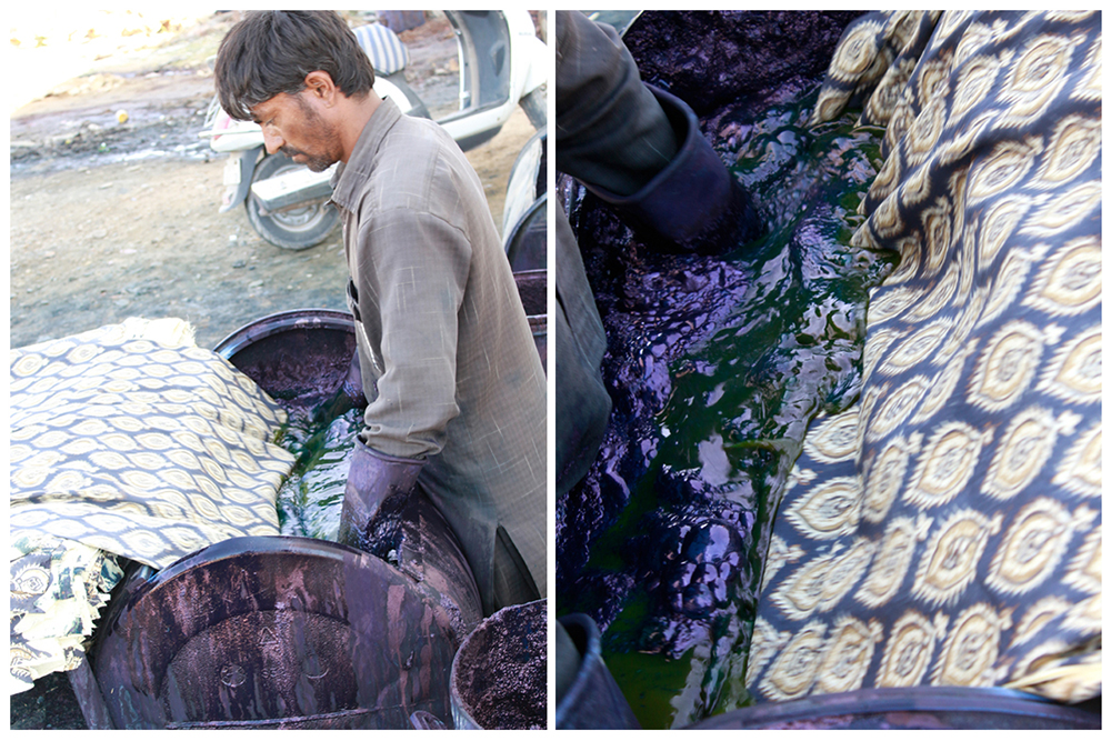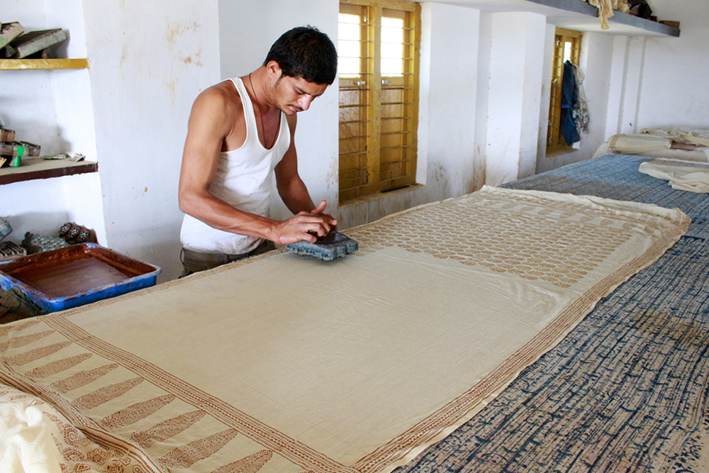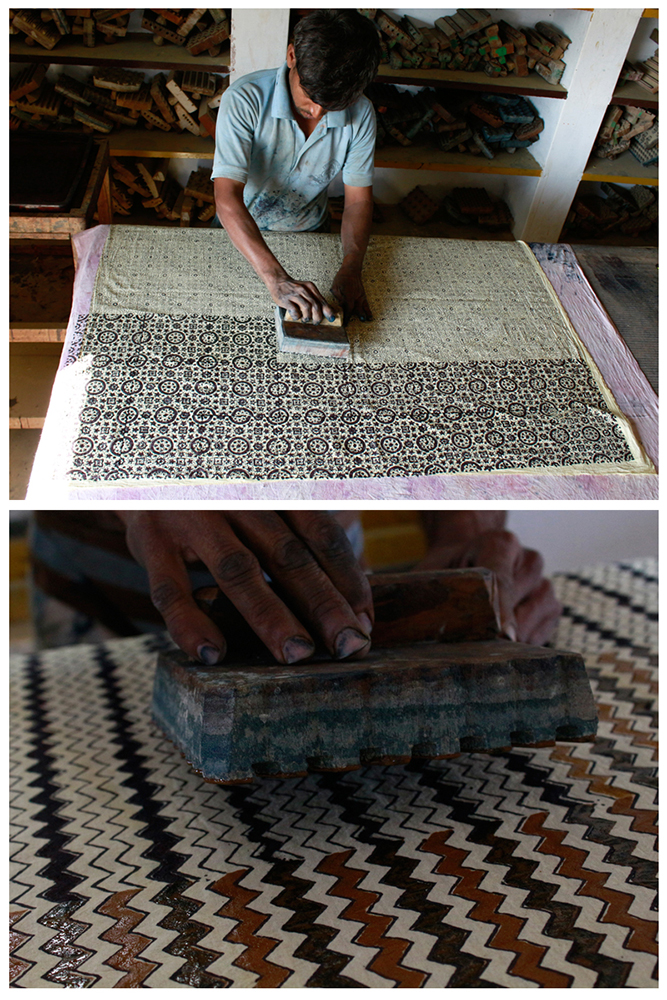 Firstly the cloth is stretched on the table and pinned. The printers spread the cloth. Once the cloth is properly spread on the table, the block with designs is dipped in the dye container and hit on the cloth with a whack. This is repeated a number of times until the patterns are completed on the cloth. Later the cloth is dyed in a base and allowed to dry under the sun. The cloth is rinsed and dyed again to transform it into the look of a painting of colors and themes. Before beginning to actually print on cloth the cloth undergoes several steps to become suitable for the print process for the ink or the dye to last for a long time. The cloth is soaked in water and steamed to soften it. It is washed over with oils and dried to attain a dull beige color. Once the cloth is processed it is later taken to continue with the printing process.