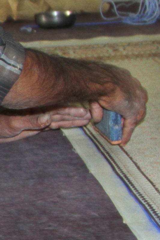 For white print- Arabic gum and Lime stone (chunna) are stirred well and this mixture can be used for about two days’ processes with minimum of two times stirring in a day. To highlight white, cream colors in the blue cloth, it is print with the white mixture. The hardae fabric is spread on the printing table and printed with outline blocks (Rekh) with white print on both sides of the fabric. The white print reserves the areas of the fabric to which it is applied with lime and Arabic gum. The white printed fabric is dried under sunlight for about 15- 20 minutes.