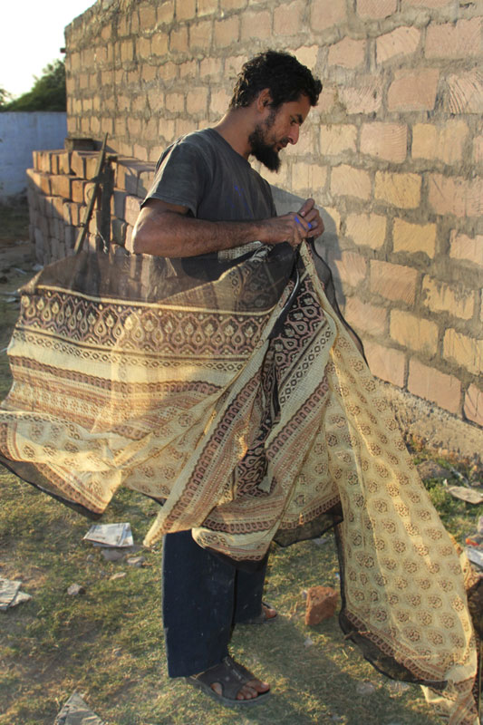 Ajrakh Block printing undergoes various stages of process of printing and dyeing. The selected cream (any light color) cotton fabric is soaked in water for overnight and lashed with the wooden beater (bat shape wood) in the flowing water to remove the starch content and impurities in the fabric.