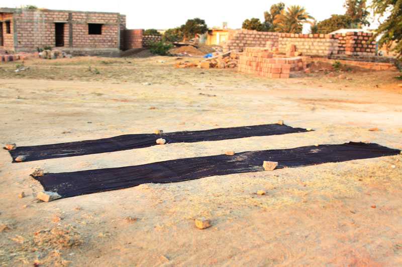 For black print- Iron and Jaggery mixed with water, kept for about 15 -20 days. This solution is mixed well with the tamarind seed powder and boiled up to 80-90 degree centigrade for about 30 minutes and cooled. The black print mixture is poured in the printing tray, spread evenly and printed with blocks locally called as Kat.