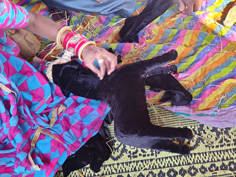 The very first step for making animal puppets is cutting bamboo sticks and joining them together to make a basic body structure. A dried husk is used and tied with thread on the bamboo structure to give the body shape. Once the basic body shape is formed, it is covered with fabric. Different types of colourful cloths are used to cover the body structure of the animal. The fabric is stitched with a needle and thread.