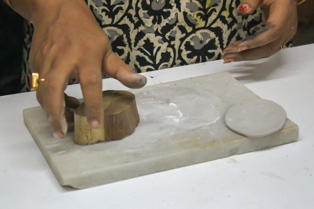 Firstly, the artisan starts with the production of the clay required for the craft. Here epoxy compound white M-seal and polyamide hardener are mixed separately with silica powder for lighter and darker shades of clay. When these materials are mixed, a chemical reaction takes place to harden the mixture. This produced clay is then dusted with talcum powder for a hard yet smooth texture. When the clay is ready, it is flattened with a rolling pin and cut into three diamond shapes with a knife. These shapes are then transferred on to the bamboo board to make a pendant. Later, a hole is pierced at one side edge to hold metal rings. This step is followed by designing clay molds with different impressions created using wooden motifs. After the clay mold dries, it is painted with dramatic 3D acrylic colors for an embossed look and unique texture. Then a jewelry wire is cut using a cutter and pierced into the jewelry hole to make a ring-like structure. The artisan then inserts a black cotton rope to make a pendant. This is how a beautiful pendant is made ready to wear and match up with any attire.