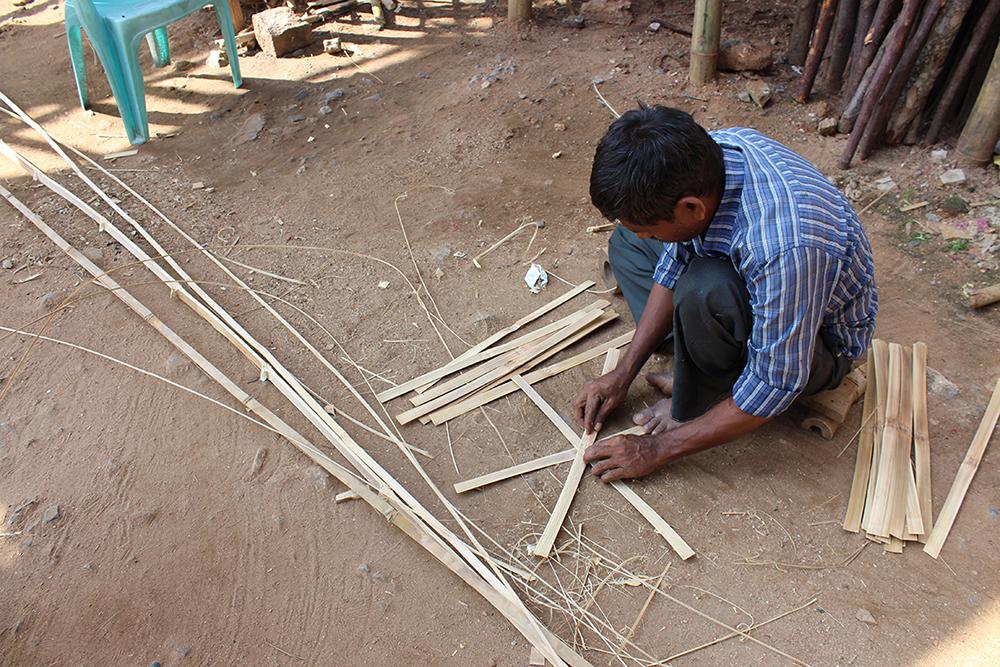 Dried Bamboo is split and used to make a traditional basket. Several patterns are developed while weaving a basket. The artisan makes both conventional as well as new products. Splits of Bamboo are beautifully weaved in different patterns to make a variety of baskets. The thick wide strips are first placed to make the base. Artisan circularly arranges the strips to make the base of the basket. Thin strips are weaved by overlapping the base strips. Once the base is formed, the side walls are increased by adding additional bamboo strips. Bamboo strips are joined one after another for the continuity of weaving. Weaving is done until the required height is reached. Once the weaving is completed, the rim is inserted with two thick bamboo splits to interlock the border.