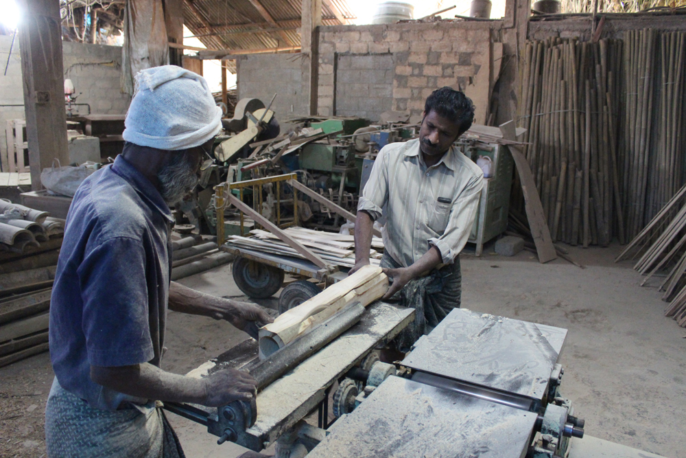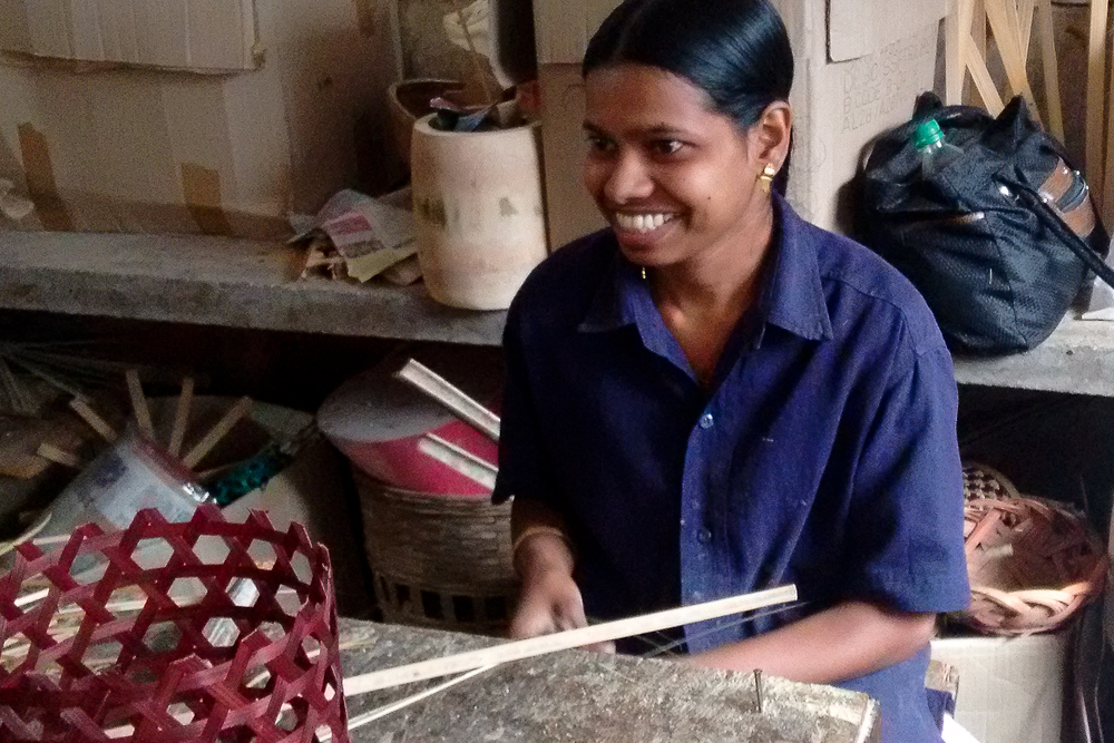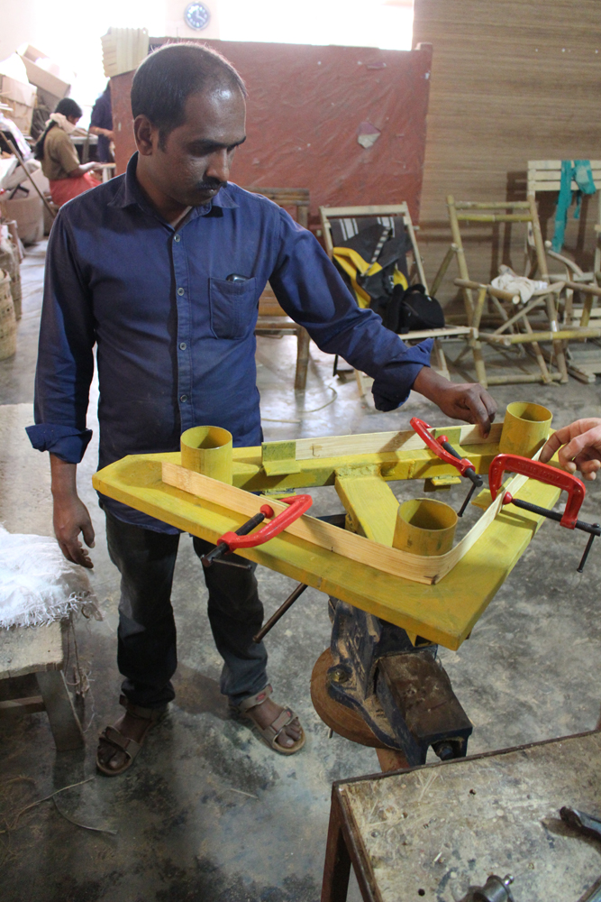 The raw material is basically acquired from Uravu. The bamboo used to paint over is locally called as aanamula (literally converted elephant bamboo). They are the giganteus species. The bamboo is cut to the required dimensions in the machine room at Uravu and then send to Bhavm. They are then painted white so that the bright colours used do not lose their vibrancy. The basic drawing is then made over the white surface with pencils and pens.