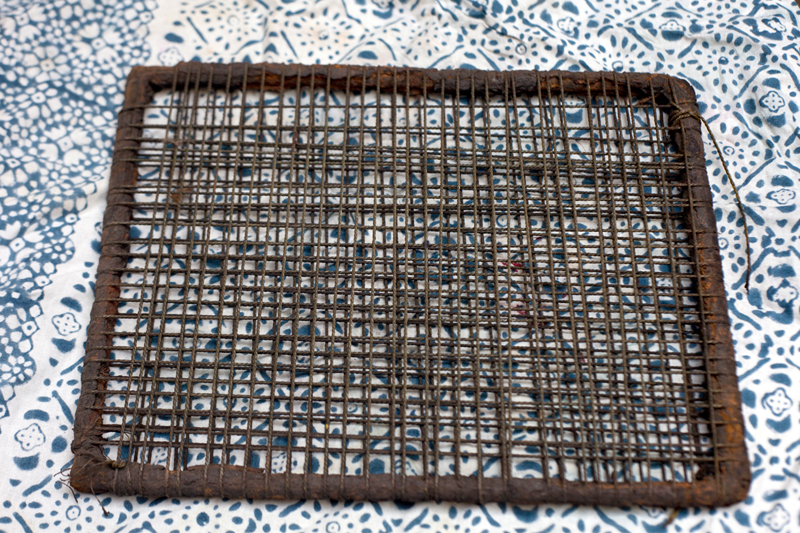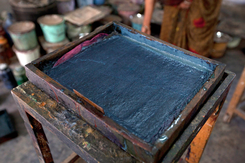 Colors used for printing are kept in a wooded tray called as saaj. Once the color is poured into the tray wire mesh is placed inside. This mesh is covered with a piece of felt. Felt soaks the color and finally a fine cotton/malmal cloth is placed on the felt. This preparation helps in proper application of color on the block.