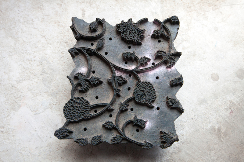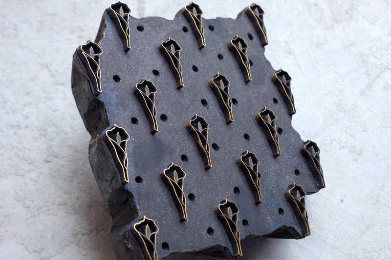 For making intricate patterns and getting high level of clarity in prints metal blocks are used. These blocks are made by engraving thin sheets of evenly cut metal strips into the wooden blocks. The metal strips are beaten to make them thin and then strips are cut of even length. The design is drawn on the wooden block and the metal strips are pressed onto the design by gentle hammering. Filling of the designs is done from center to outside. Once made the blocks are checked to see the strips are of the same height from the wooden base. Metal blocks are costly, time consuming but long lasting.