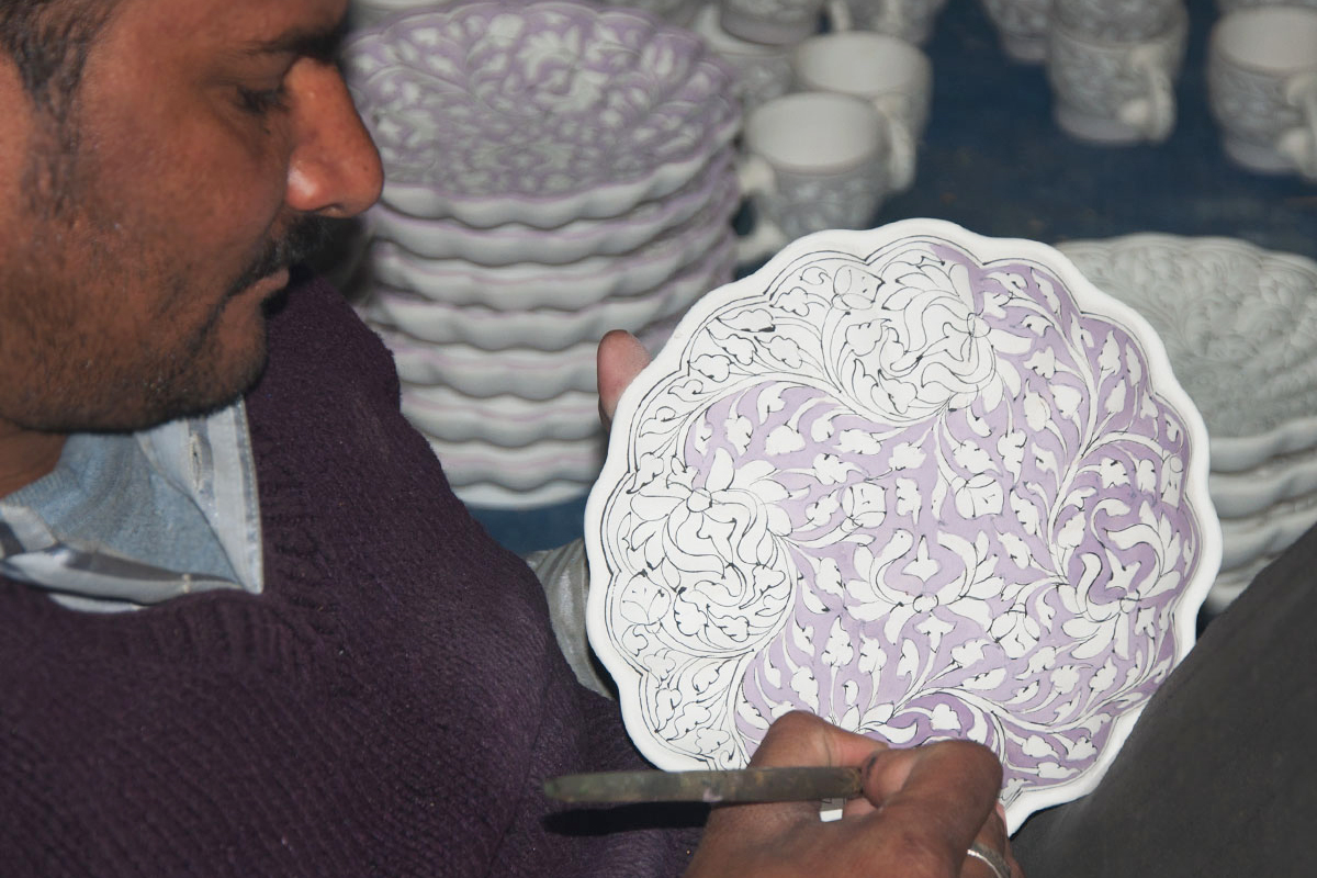 The products are ready to get painted after the smoothening process is done. Artisans follow or sometimes come up with their own designs. All products are painted by hand. First the outlines are drawn with the fine brush or custom-made artist brush. If the product is circular shape then the outline is easy to give, product is just placed on potter’s wheel and by touching the tip of brush to the product a neat line could be drawn. After the outlines, colors are filled in the spaces and that complete designs.