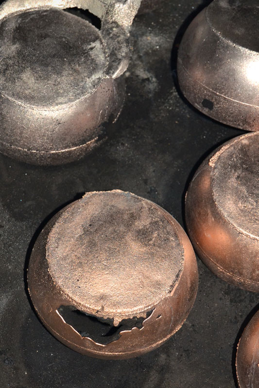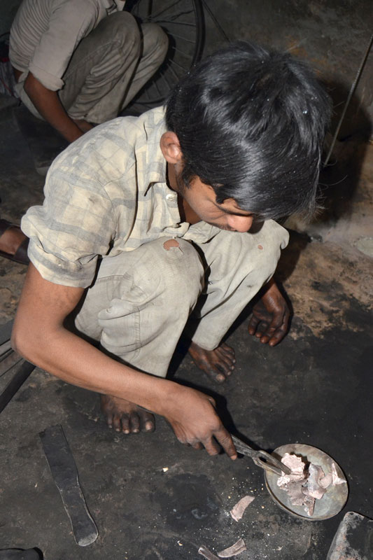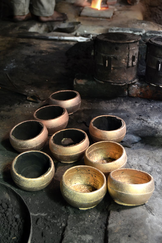 Sand casting is the traditional method of making brass ware. Sand is used in the two halves of the mould box to cast the metal which is prepared by packing sand (locally called ‘masala’) around the ‘master-copy’ tightly. The chemical binder in the sand aids in holding the shape of the mould after which it is removed and molten metal poured in its cavity. After being allowed to cool for few minutes, the cast metal is removed from the mould box. The sand and the ‘gating’ (path way made in the mould for directing the flow of molten metal into the cavity) are broken from the cast using a hammer. These are re-used in the next casting.