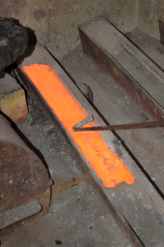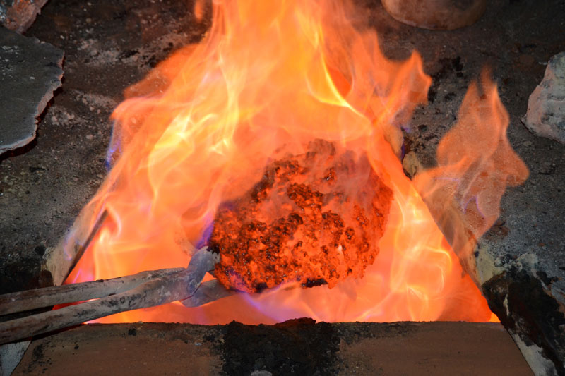 coal-fired furnace. The raw materials are a mix of many metals namely copper, zinc, lead, etc. in a specified ratio. A flux is also added to remove the impurities. These are molten in a huge container for about twelve hours to produce 350 kilogram of brass at one go. The molten metal is left to cool on basic iron moulds to form strips that are then sent to the casting craftsmen.