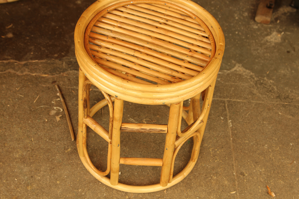 Rattan is a long stem of certain trailing or climbing palms. They are rated as minor forest products, in spite of the fact that they are probably the most important forest products, after timber. They belong principally to the palm family of the genus Calamus, but a few other related genera like Daenonorops, Ceratolobus, Plectocomia and Koerthalsia yield canes of lesser importance. The internodes vary in length and thickness in different species and even in different plants of the same species. The core of the stem which are soft and spongy, are made up of coarse fibers. The first step is skinning the surface of the rattan. With the help of a sharp knife outer skin of the stem and the knots are peeled and removed. The cane is cut into desired length. The stem is then heated using a blow torch and bending tool to bend the material into required shape which has limitation. Artisan arranges them together to build the basic frame (structure) of the furniture after bending. Base of the furniture is built first by nailing in the required form. After the parts of the furniture are nailed together in the required manner; the frame is then filled by binding the cane strips or thin rattan stems over the frames. The nailed joints are then tightly bound by lengths of split cane strips which acts as cover, both to cover the visible nails and to give additional rigidity. The binding details sometimes have a decorative quality. Clear varnish, enamel paints are applied over the finished product. Generally the natural surface of the cane is retained without any surfaces application. Rattan accepts colors and it can be worked into many styles.