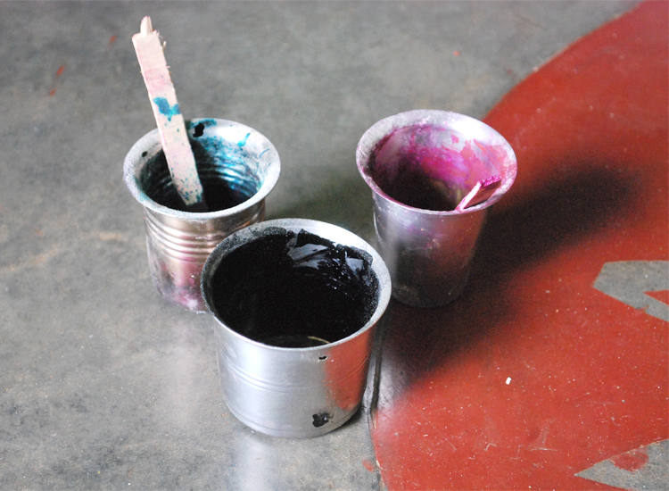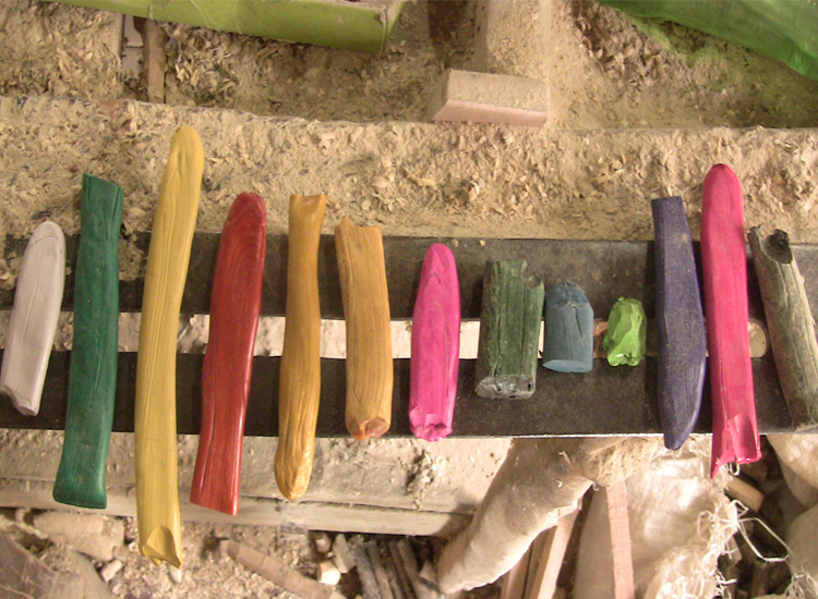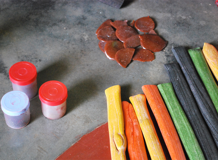4. Coloring is done using vegetable dyes while the wooden block is still rotating on the lathe.