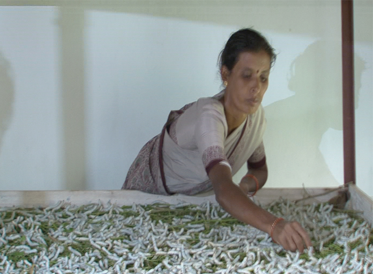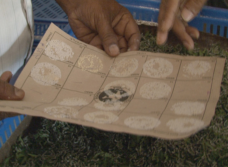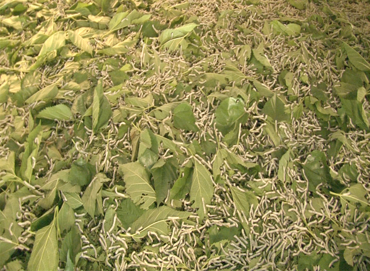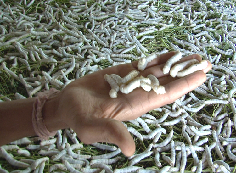 Mulberry branches with green leaves are put over the rearing bed and when the worms crawl onto them. The branches are taken out along with the mature worms. The branches are then shaken off over a mat to dislodge the worms and the worms are collected in a bamboo basket. After feeding, the mature worms which do not feed anymore will come out and crawl onto the net. The net is taken out and shaken off over a mat to dislodge the matured worms that are collected in a basket.