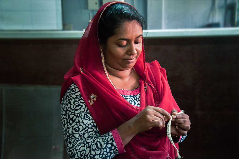 Firstly the coir strands are taken out of the husk. For making of the coir jewelry the coir is taken from the immature green coconut and soaked in water for months together. Later the coir strands are naturally dyed with pleasant colors. Small articles like sequences, pearls, crystals, stones and studs are used in embellishments for the jewelry. Initially, the longer coir strand is picked and sewed onto a thin stick (pen refill) in order to make a ring with the help of needle. The rings are made in bulk which is then comprehended in making a finger-ring by binding all the linked rings together and sewing them in an appropriate manner like how plaiting is made. Sometimes the coir is winded with regard to the diameter required and then a single coir is taken and sewed around the winded coir to fasten the rings in crochet technique. The protruding strands are cut with the help of nail cutter. The jewelries are made subject to the form and design thought. The coir strands are bound together, sewed and twisted to the form needed.