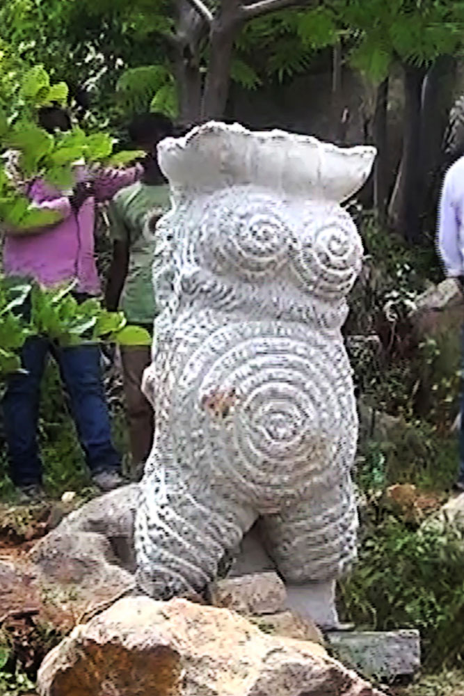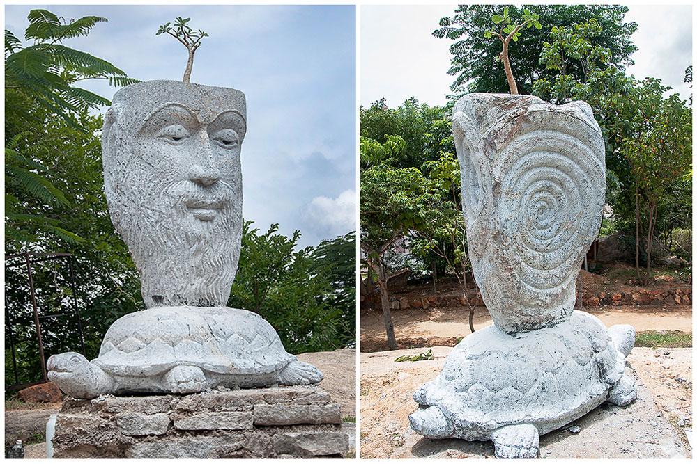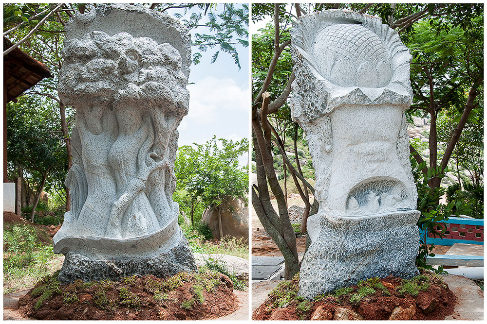 Artisan Mr. Ramnayak S is a native of North Karnataka and is a traditional sculptor. He expresses his experience in the space “Aadima Cultural Centre”, Aadima means a beginning and; Artisan introspects of his beginning and finds an ever ending path and comes to a comparison of himself to the other creations of god like natural forces water, soil and air which lands him to question oneself “Who am I”. He even involves the great three Hindu triads; Lord Brahma the creator, Lord Vishnu the preserver and Lord Shiva the destroyer or the transformer and co relates to the nature; Nature and god are interlinked. Artisan becomes a devotee of the place and thus he calls his sculpture as “Naa Kanda Devaru” (God, Whom I Found).