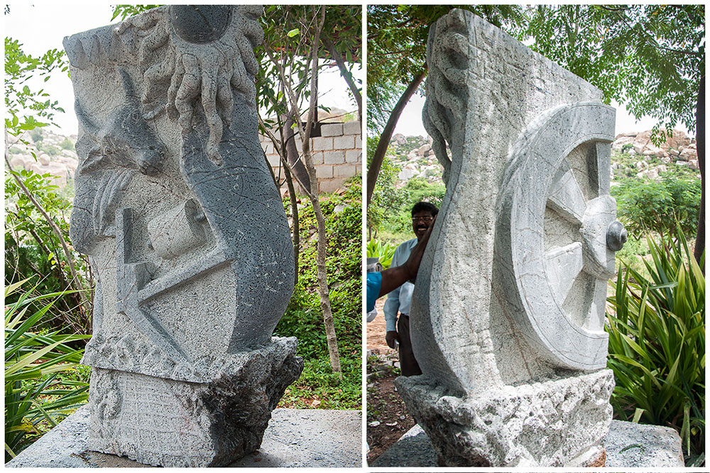 Artisan Ms. Shwetha H who has pursued Bachelor Degree in Fine Arts at Karnataka Chitrakala Parishath and Master Degree in Fine Arts in Bangalore University. This sculpture tries to unleash the cultural attributes of the place like farming, animal farming, ground roller equipment, farmland and many more. Basically artisan develops on the idea of site specific theme and beautifully composes it on the stone. Mr. Saibana and Mr. Darshan assisted the artist in finishing the sculpture successfully.